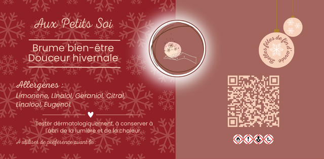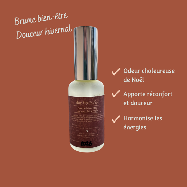 La brume bien-être Douceur hivernale offre une ambiance cozy et chaleureuse grâce à ces odeurs de Noël ! Cette brume amène reconfort, douceur et joie. Elle amène une harmonie des énergies de votre foyer. Profitez des fêtes d'hiver avec Aux Petits Soi !